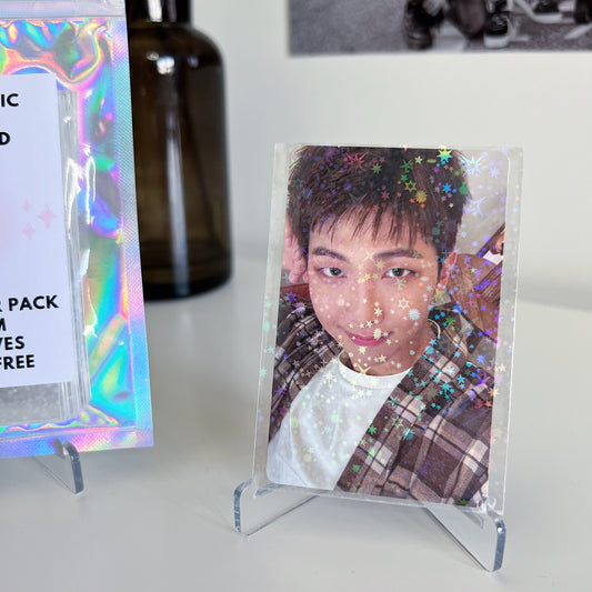 ⟡ Welcome to the sparkle zone! Our holographic photocard sleeves come in a variety of dazzling designs that’ll make your collection truly pop. From shimmering stars to glittering hearts, and dreamy flowers to edgy shards — there’s a perfect sleeve for every bias and every vibe.